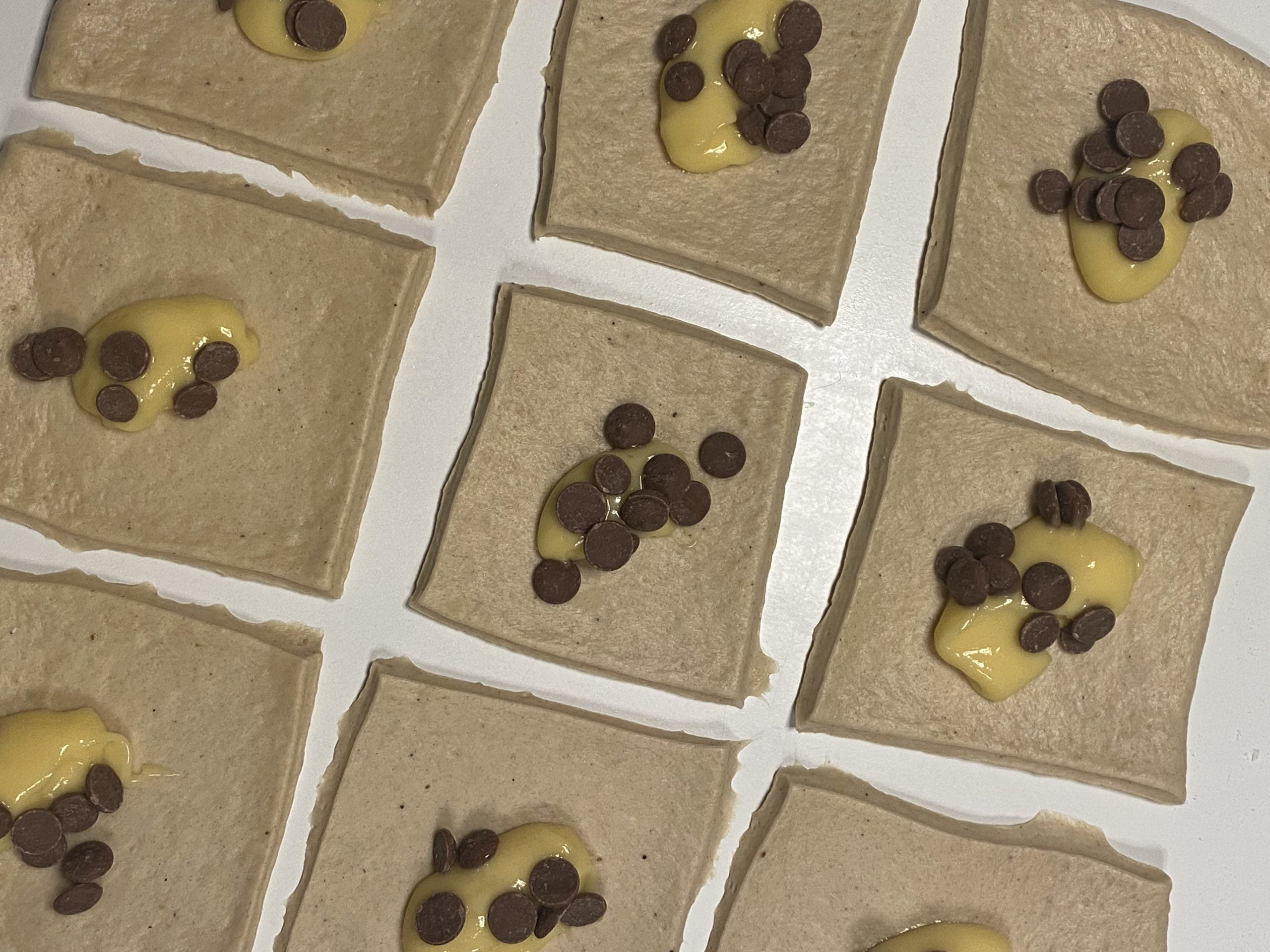 - Fold hjørnerne ind og sammen, sådan at dejen lukker helt tæt om fyldet